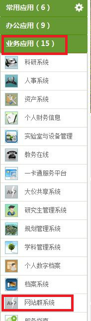 1、登录数字东林,在左侧导航条业务应用下找到网站群建设,点击进入。