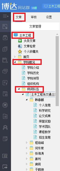 3、在文章----土木工程------KY开官网-------师资队伍下找到自己相应的教研室以及自己的名字点击左侧的向下三角箭头,进入相应栏目进行编辑。