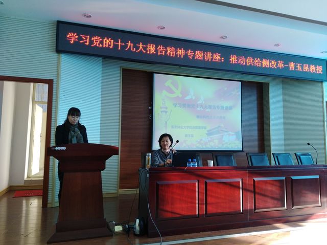 曹玉昆教授首先介绍了党的十九大提出:实现“两个一百年”奋斗目标、实现中华民族伟大复兴的中国梦,不断提高人民生活水平。必须坚定不移把发展作为党执政兴国的第一要务,坚持解放和发展社会生产力,坚持社会主义市场经济改革方向,推动经济持续健康发展。