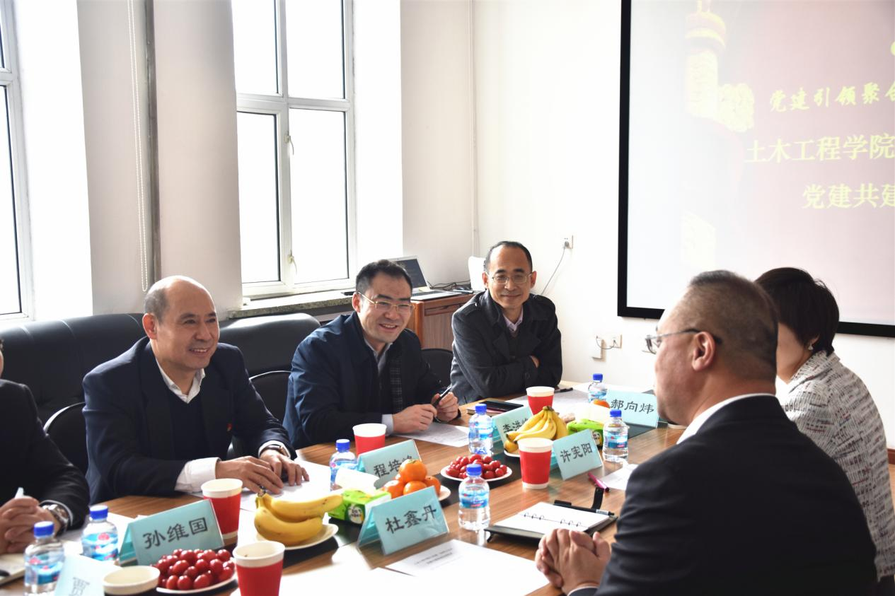 中建一局华江公司党委书记杜鑫丹,董事会秘书、人力资源部经理许宪阳,土木工程学院院长程培峰,党委书记李洪峰、副书记孙维国,院长助理、力学党支部书记贾杰,桥梁与隧道工程学科党支部书记郝向炜出席了本次活动,活动由李洪峰主持。