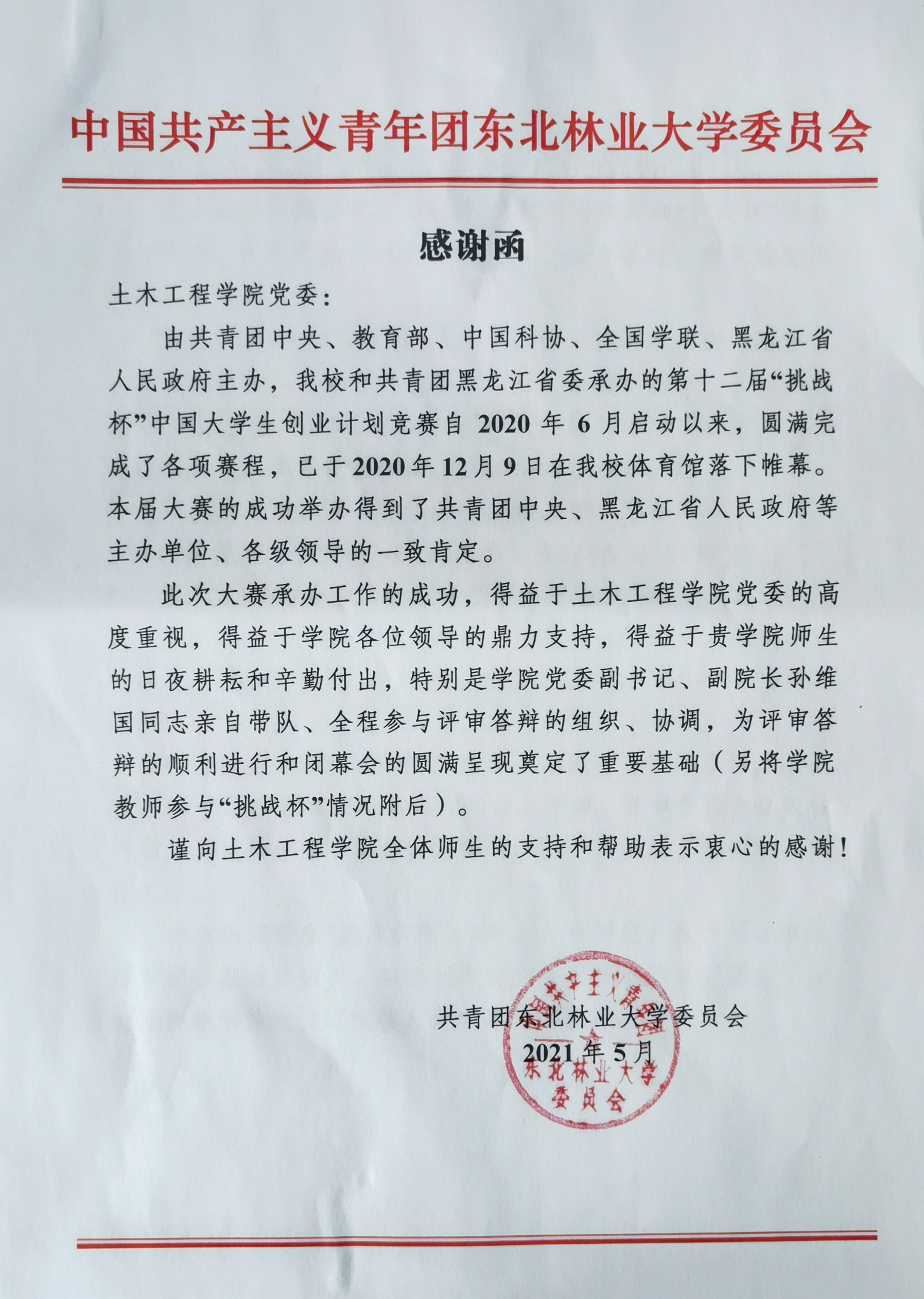 函中主要写明,我校自2020年6月启动第十二届“挑战杯”中国大学生创业计划竞赛,于2020年12月圆满完成了各项赛程。此次大赛的成功承办得益于土木工程学院党委的高度重视,得益于学院各位领导的鼎力支持,得益于学院师生的辛勤付出。