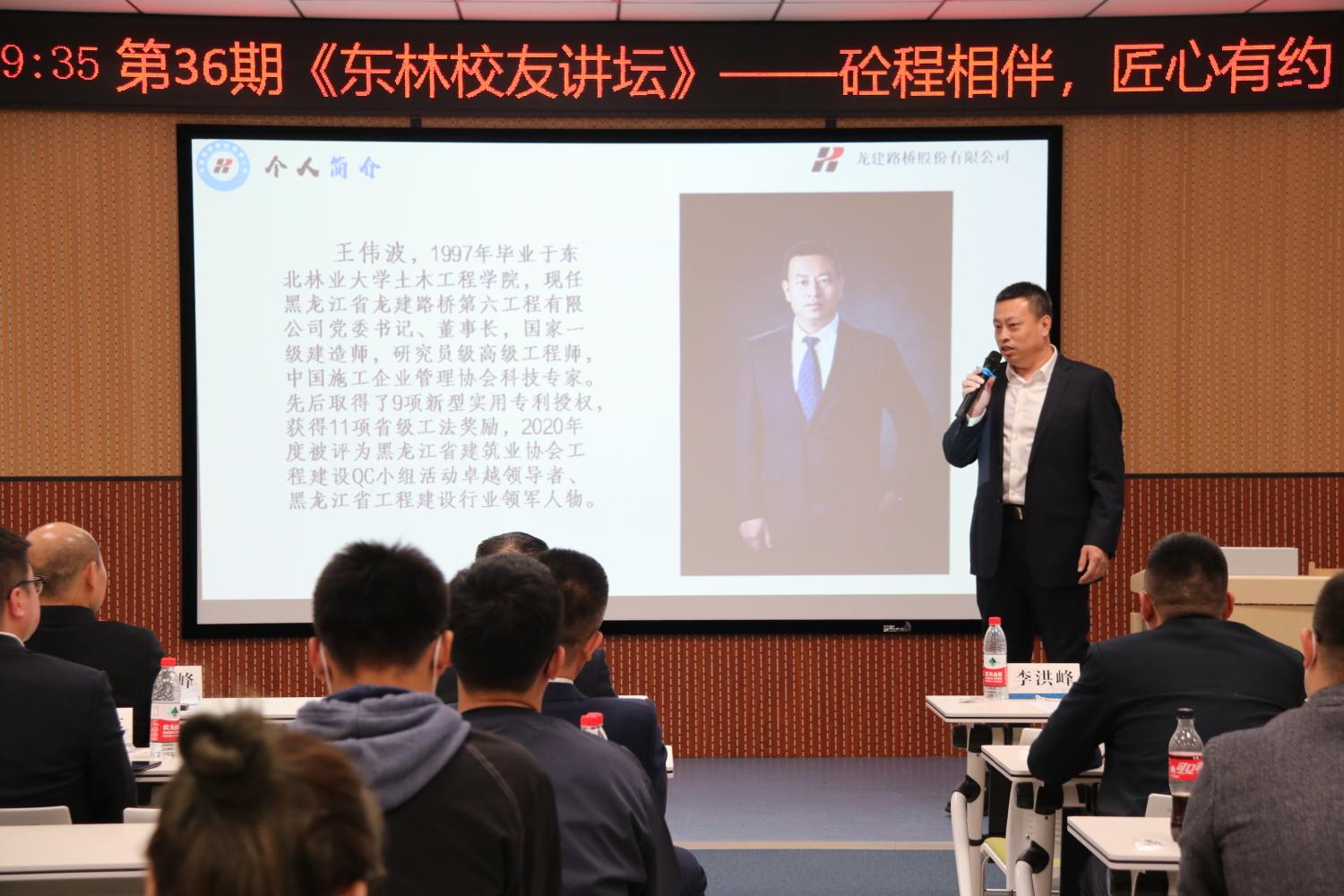 王伟波校友就“定向、定点、定位、定心”四定对土木学子的人生规划提出建议。工作以来,他长期坚守在施工生产一线,从事公路桥梁工程的施工与管理,拥有丰富的施工管理经验,先后主持参与了20余项施工课题项目研究,取得了9项新型实用专利授权,获得11项省级工法奖励;荣获“黑龙江省建筑业协会评为工程建设QC小组活动卓越领导者;中国施工企业管理协会科技专家;2020年度黑龙江省工程建设行业领军人物”等称号。他始终秉承着“修路架桥、奉献社会;以人为本,追求卓越”的经营理念,厚德载物,自强不息,带领龙建六公司员工以开拓进取、创新奋进的精神,朝着“全面建成具有国内竞争力的一流企业”目标疾速迈进。