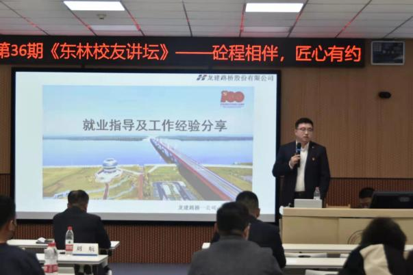10月26日下午,龙建路桥股份有限公司陈彦君、黑龙江省龙建路桥第六工程有限公司王伟波、黑龙江省龙建路桥第一工程有限公司 史伟鉴、黑龙江省龙建路桥第五工程有限公司吕晨旭、黑龙江省龙建路桥第六工程有限公司内业技术员李金洁做客第36期《东林校友讲坛》,在我校奥林学院001报告厅,以“砼程相伴,匠心有约”为主题,为现场及钉钉直播间近千名师生深情讲述了他们奋斗多年的宝贵经验和人生阅历。土木工程学院院长程培峰、学院党委书记李洪峰、校团委、校友工作办公室、就业与合作发展处等相关单位负责人一同参加了活动,活动由学院党委副书记孙维国主持。