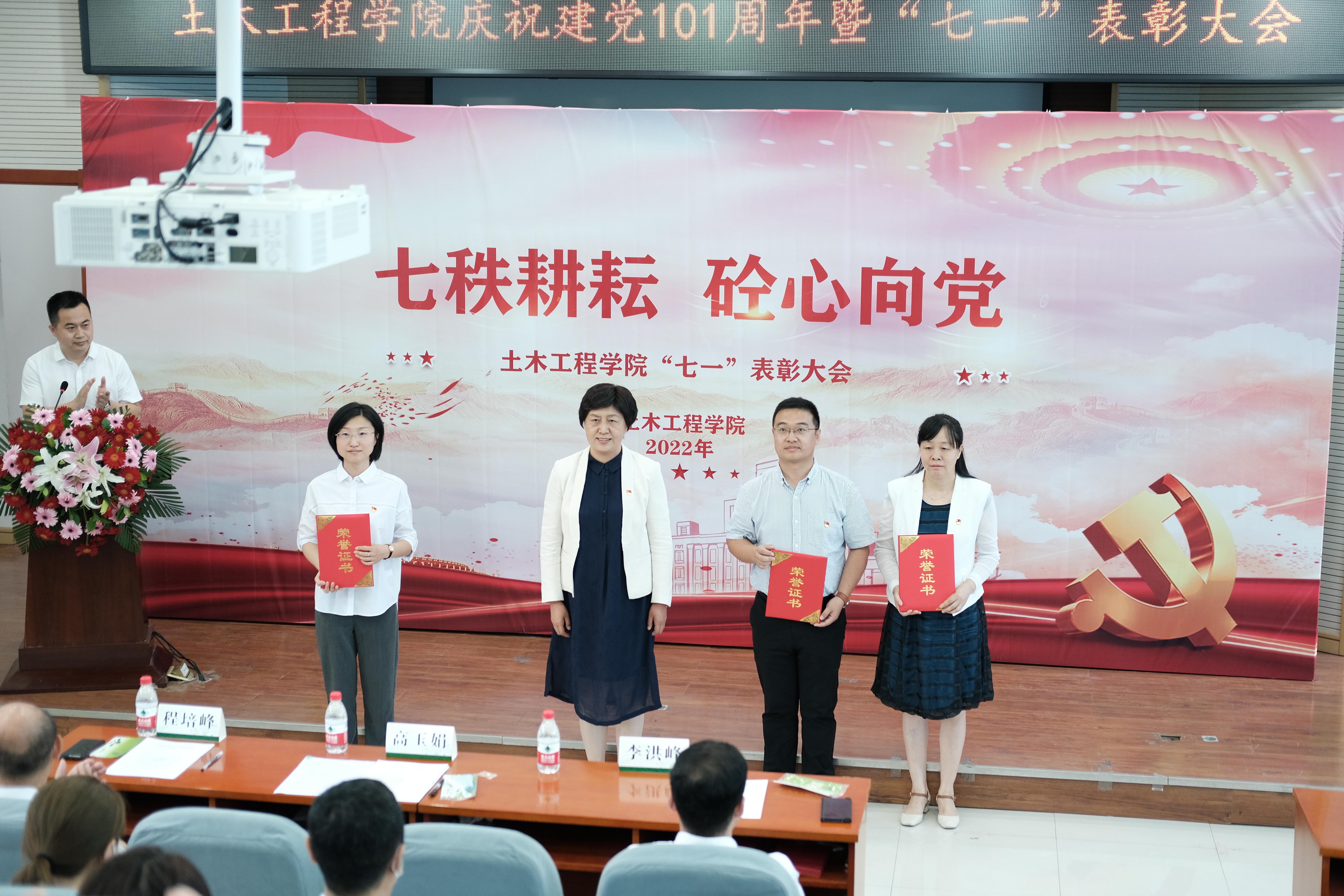 院长程培峰宣读了学院党委《关于表彰2021—2022年度土木工程学院优秀共产党员、优秀党务工作者和先进基层党组织的决定》及《土木工程学院2021-2022年度“三育人”先进个人、学院突出贡献奖名单》。李艺铭等十名党员获得“优秀共产党员”,李泽闯等五名党员获得“优秀党务工作者”,力学等三个党支部获得“先进基层党支部”,刘洁等七名教师获得“‘三育人’先进个人”,刘曙光、韩春鹏获得“学院突出贡献奖”荣誉称号。院长程培峰、党委书记李洪峰、组织部部长高玉娟为受表彰的优秀集体和个人颁奖,优秀共产党员代表李艺铭老师进行了个人分享。