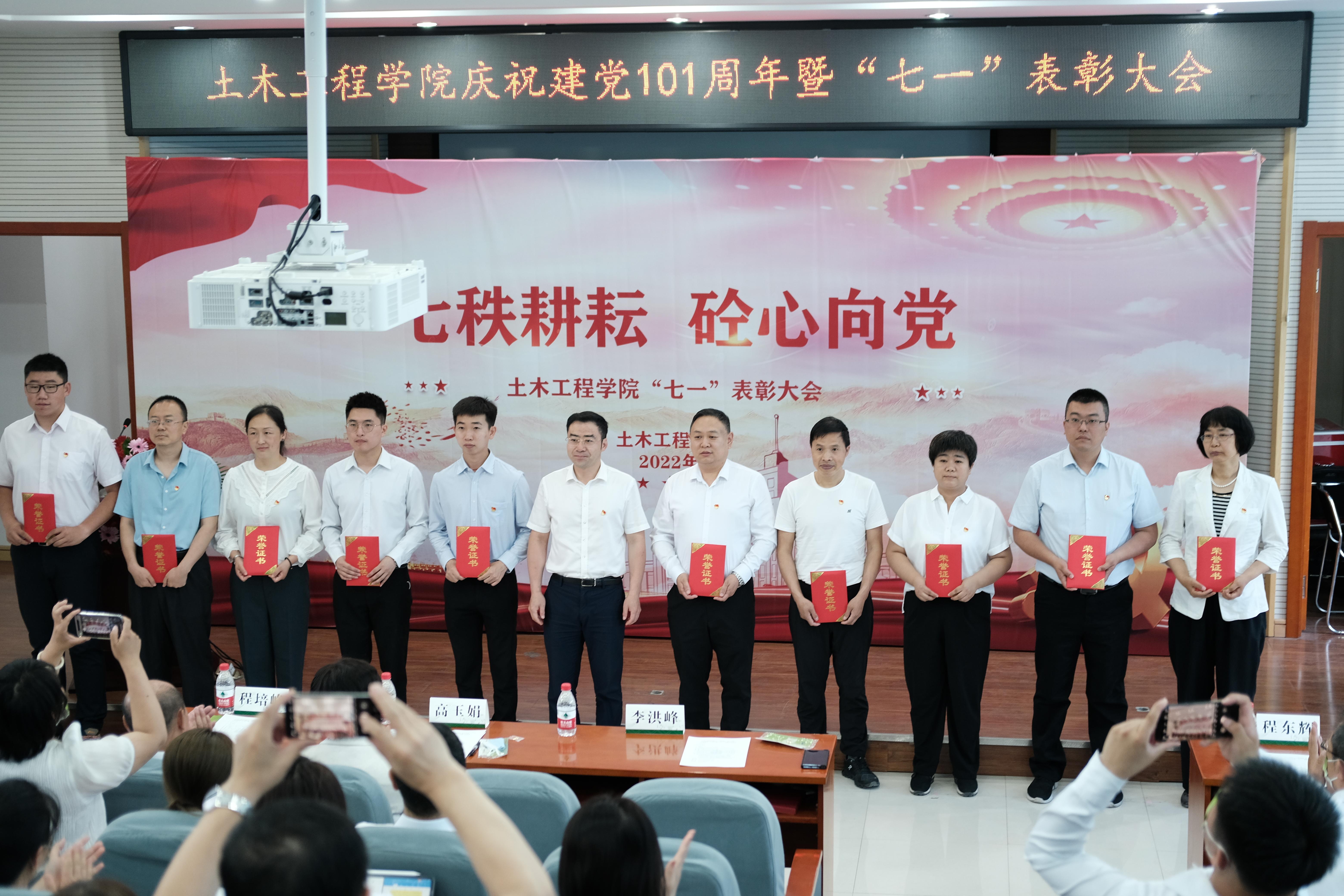 接下来,学院党委书记李洪峰对受表彰的集体和个人表示祝贺,并向全体党员表示节日的问候。他回顾一年来学院党委党建工作,指出学院始终坚持以习近平新时代中国特色社会主义思想为指导,聚焦立德树人根本任务,围绕学院建设发展目标,以党建为引领,创新思路、狠抓实干,扎实推进学院各项工作再上新台阶。通过严肃党内政治生活、进一步规范“三会一课”、抓好支部书记党建工作述职评议考核,全面加强党的领导;通过多种渠道引进青年骨干4人,A类英才博士后1人,针对博士点学科建设成立6个推进小组,多措并举激发和释放学院人才集聚效应;召开全院研讨会、推进会,合力攻关硬任务、硬指标,修订、出台10个整改相关文件,落实推进学院巡察整改工作;以“12345”模式落细落实党史学习教育,成立“砼学”党建工作室,形成了“横”到支部、“纵”到任务的支部网格化管理模式,全面推进党史学习教育;完成了院史编写、院训凝练、院标设计、院歌谱写、网站建设等工作,进行优秀校友走访和联络,加强学院文化建设,为迎接学校70周年校庆工作做好了充足准备。最后,他提出三点希望:坚定理想信念,坚守育人初心;立足自身职责,强化责任担当;对标先进典型,汲取奋进力量。