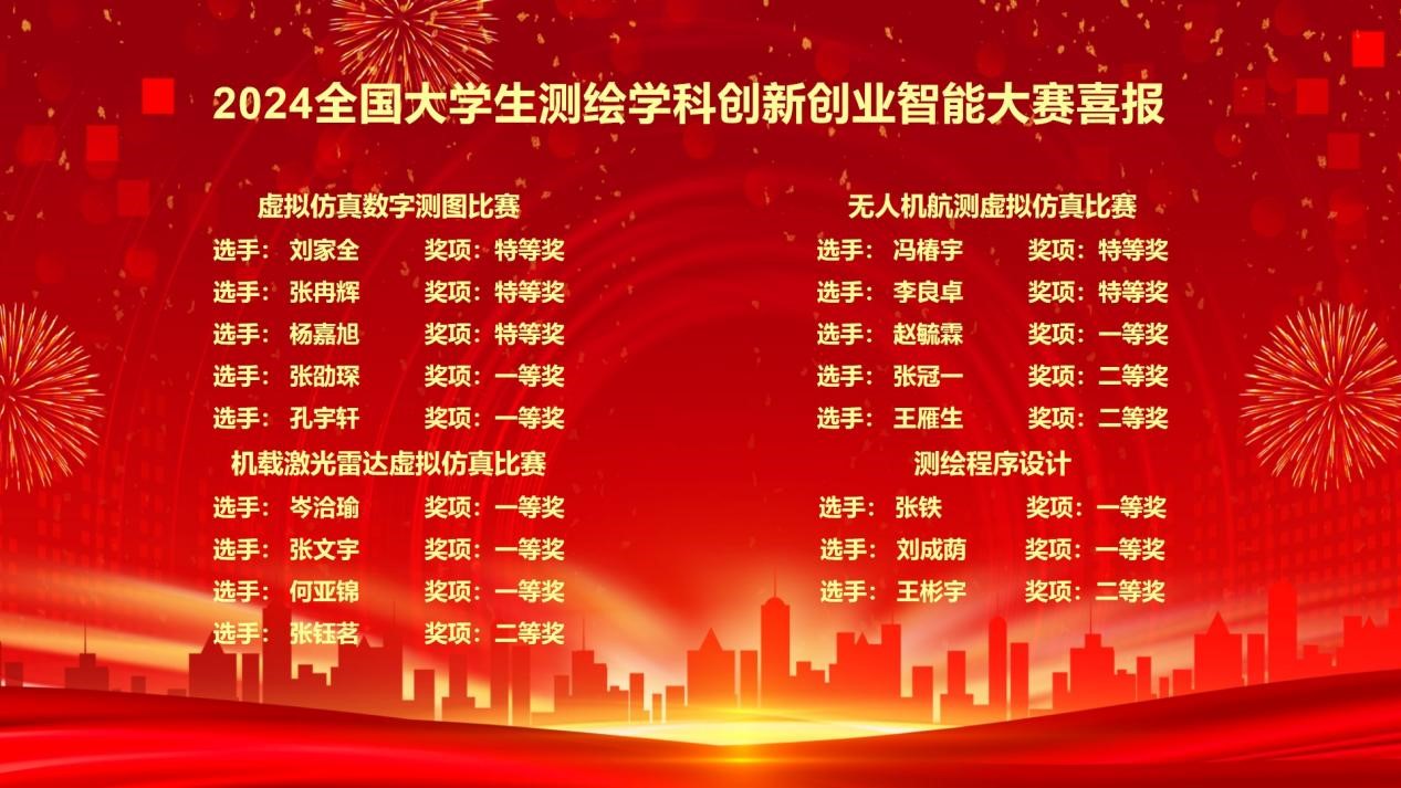 7月29日,2024年全国大学生测绘学科创新创业智能大赛在滇西应用技术大学隆重举行,该项赛事已被纳入《2023全国普通高校大学生竞赛分析报告》竞赛目录。本次大赛由中国测绘学会教育工作委员会主办,共吸引360多所高校、近8000名学生参赛,赛事规模创历届大赛新高。我校学生获得特等奖5项、一等奖8项、二等奖4项,取得我校参加该项赛事的最好成绩。