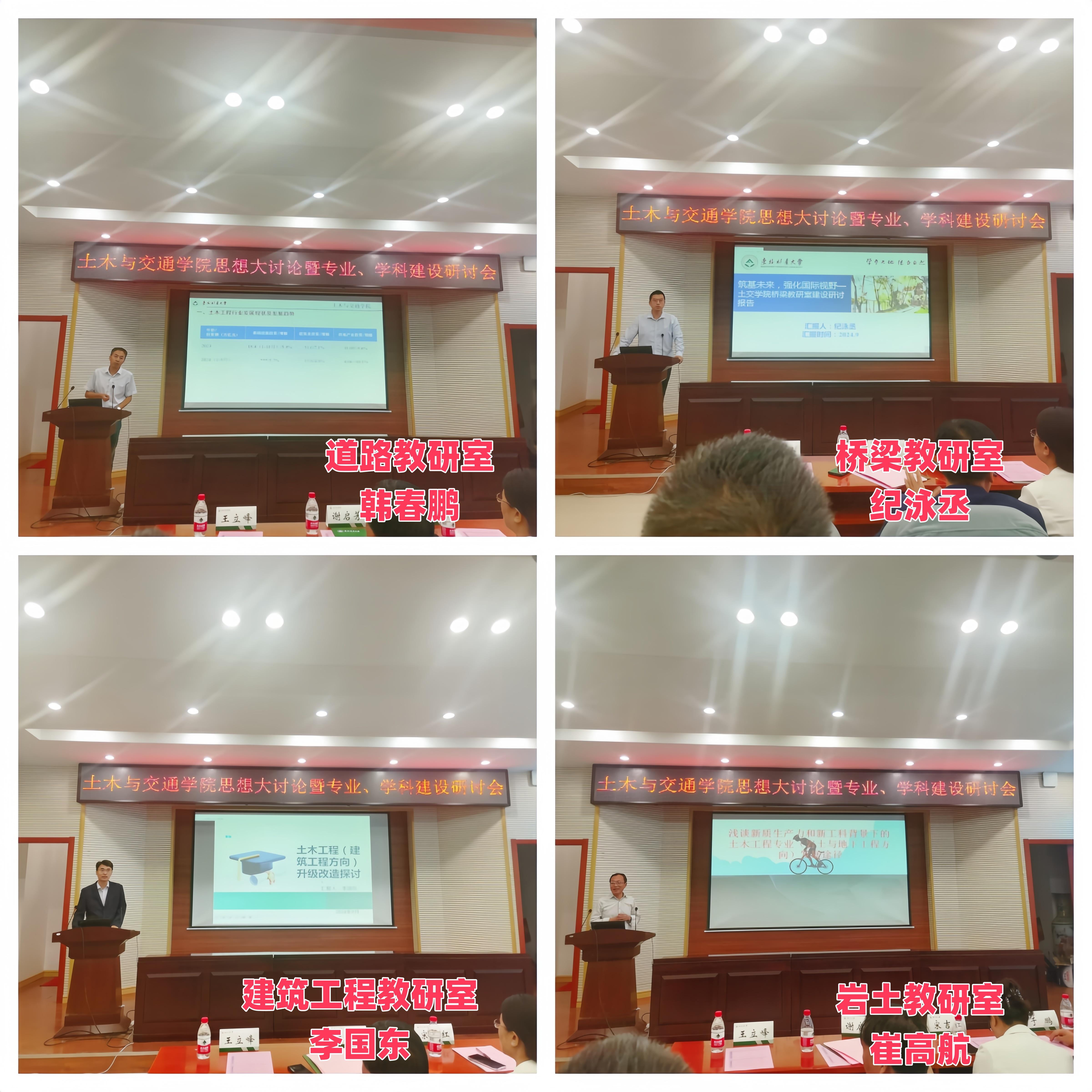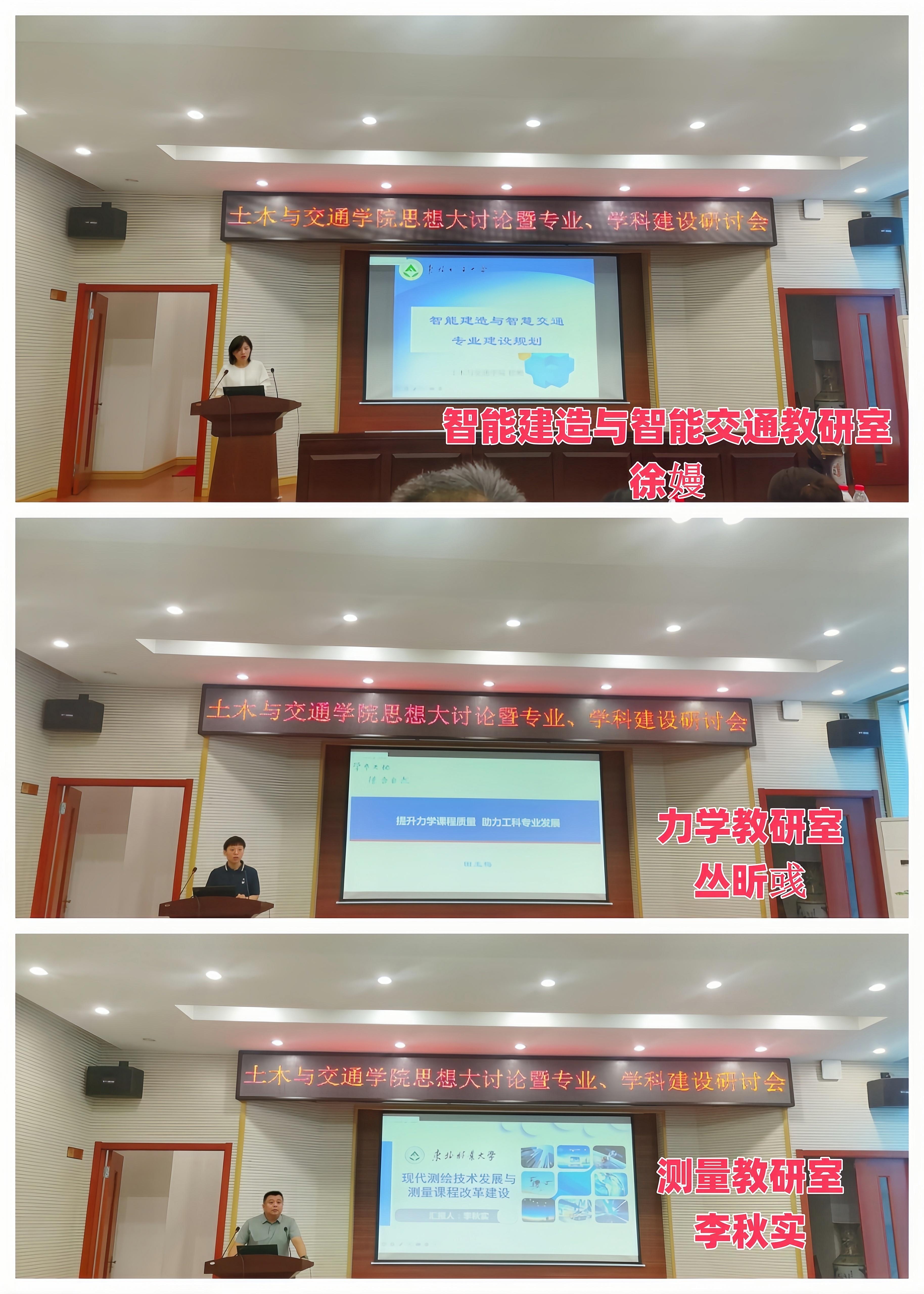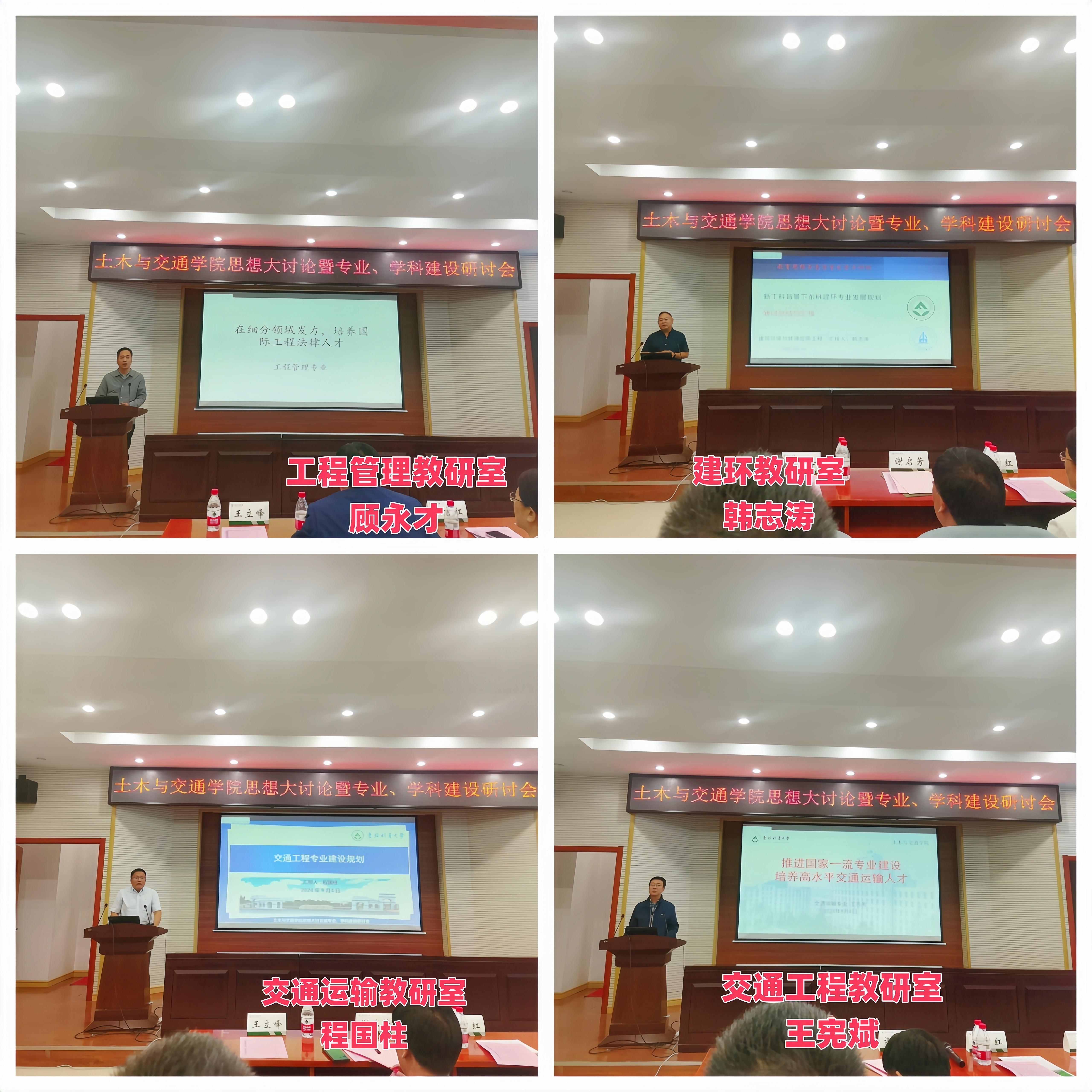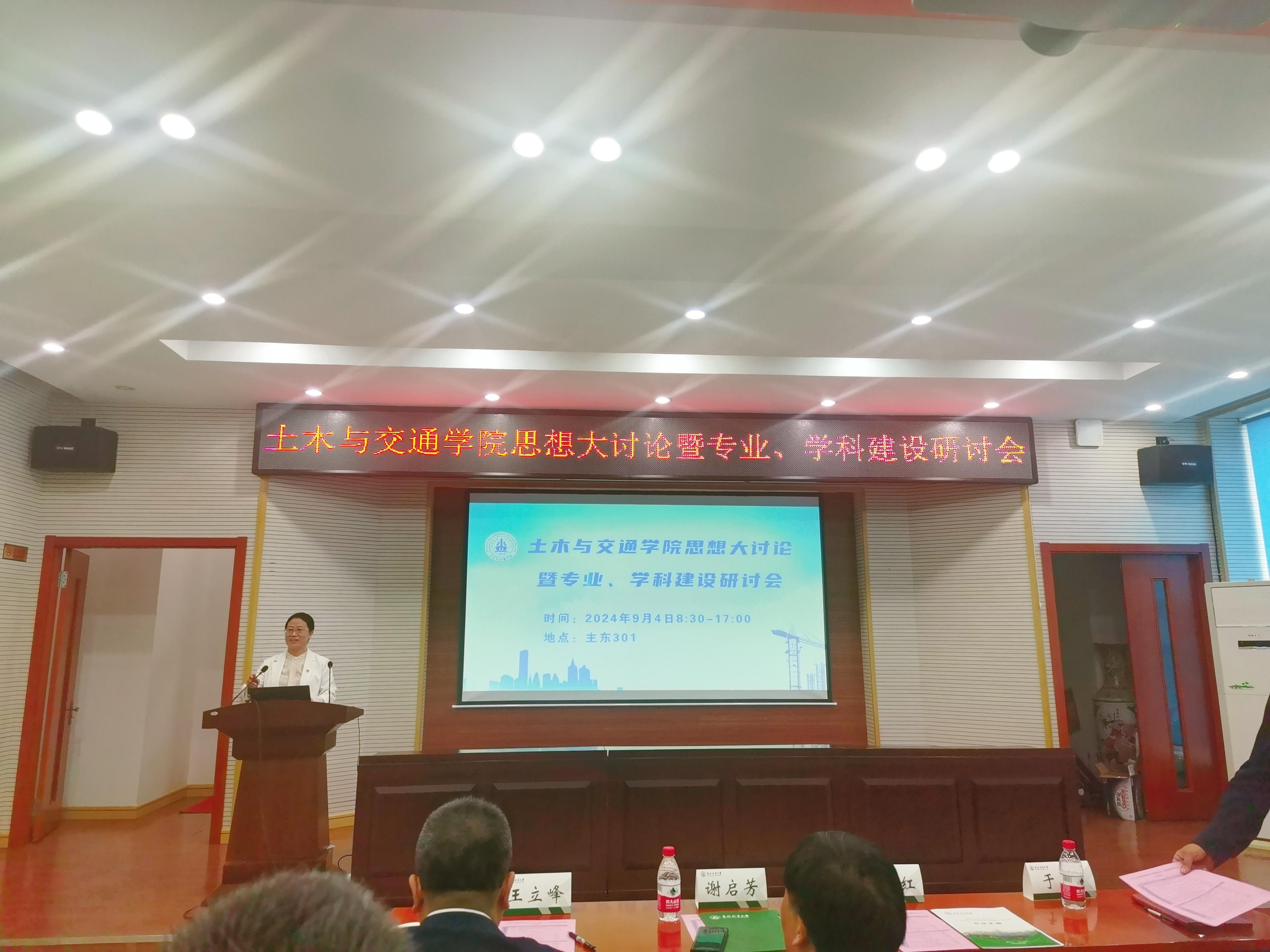 会议分两个阶段进行,上午召开专业建设研讨会,由教学副院长张文会同志主持。各专业教研室主任分别就专业建设相关内容进行汇报,包括“新形势下土木工程专业的建设思考”、“筑基未来,强化国际视野—土交学院桥梁教研室建设研讨报告”、“土木工程专业(建筑工程方向)的升级改造探讨”、“浅淡新质生产力和新工科背景下的土木工程专业(岩土与地下工程方向)发展途径”、“在细分领域发力,打造国际工程法律人才培养基地”、“新工科背景下东林建环专业发展研讨总结与汇报”、“交通工程专业建设规划”、“推进国家一流专业建设 培养高水平交通运输人才”、“智能建造与智慧交通专业建设规划”、“提升力学课程质量,助力工科专业发展”、“现代测绘技术发展与测量课程改革建设”等议题。汇报过程中,宋吉红、谢启芳等同志和专业教师分别就教师队伍建设、社会需求与人才培养差距解决办法等方面与专业和教研室主任进行了交流讨论。