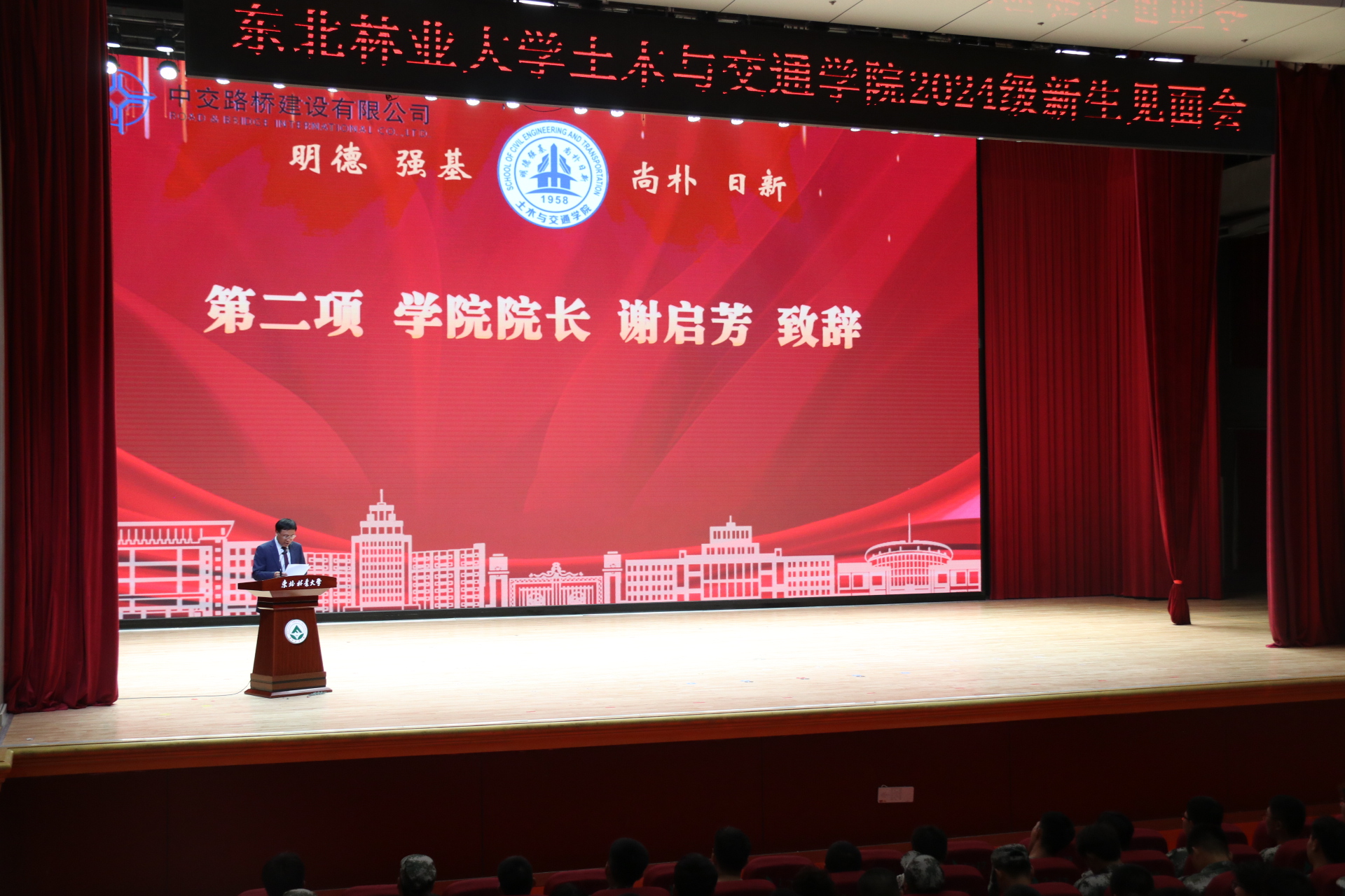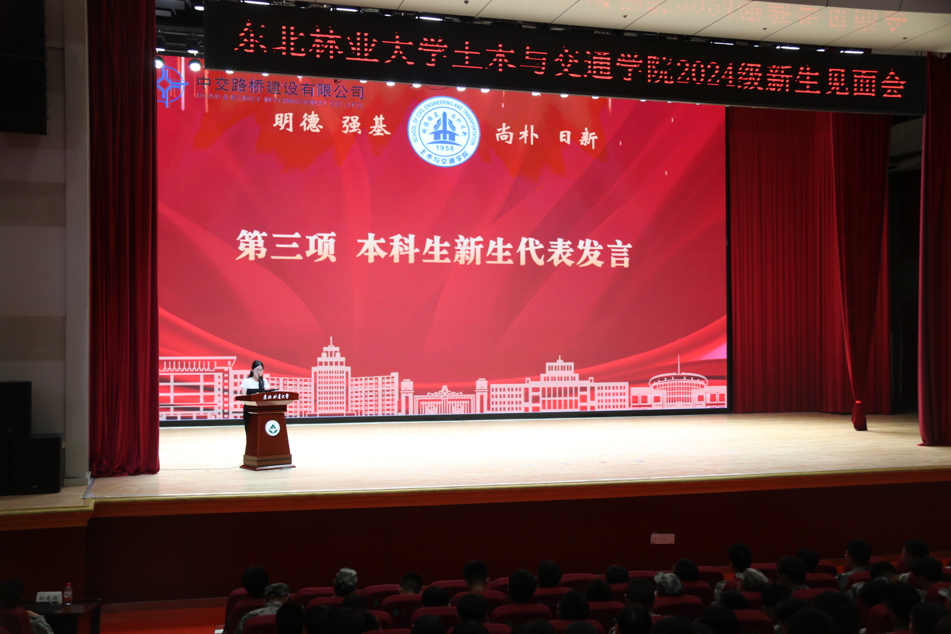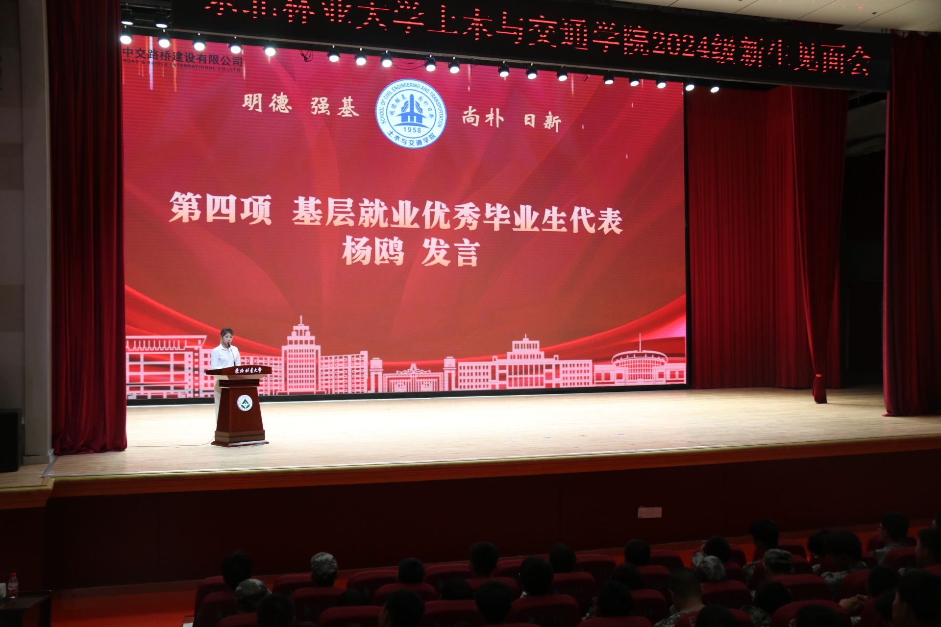 本科生代表郑智莹进行发言,她对现场的领导、老师与学长学姐们表达了衷心的感谢,对未来的大学生活充满期待,会在东林校园里心有所向、感悟知识的伟大力量,用汗水扛起时代大任,自强不息、书写青春的卓越篇章,争做东林自豪的新“砼”人。