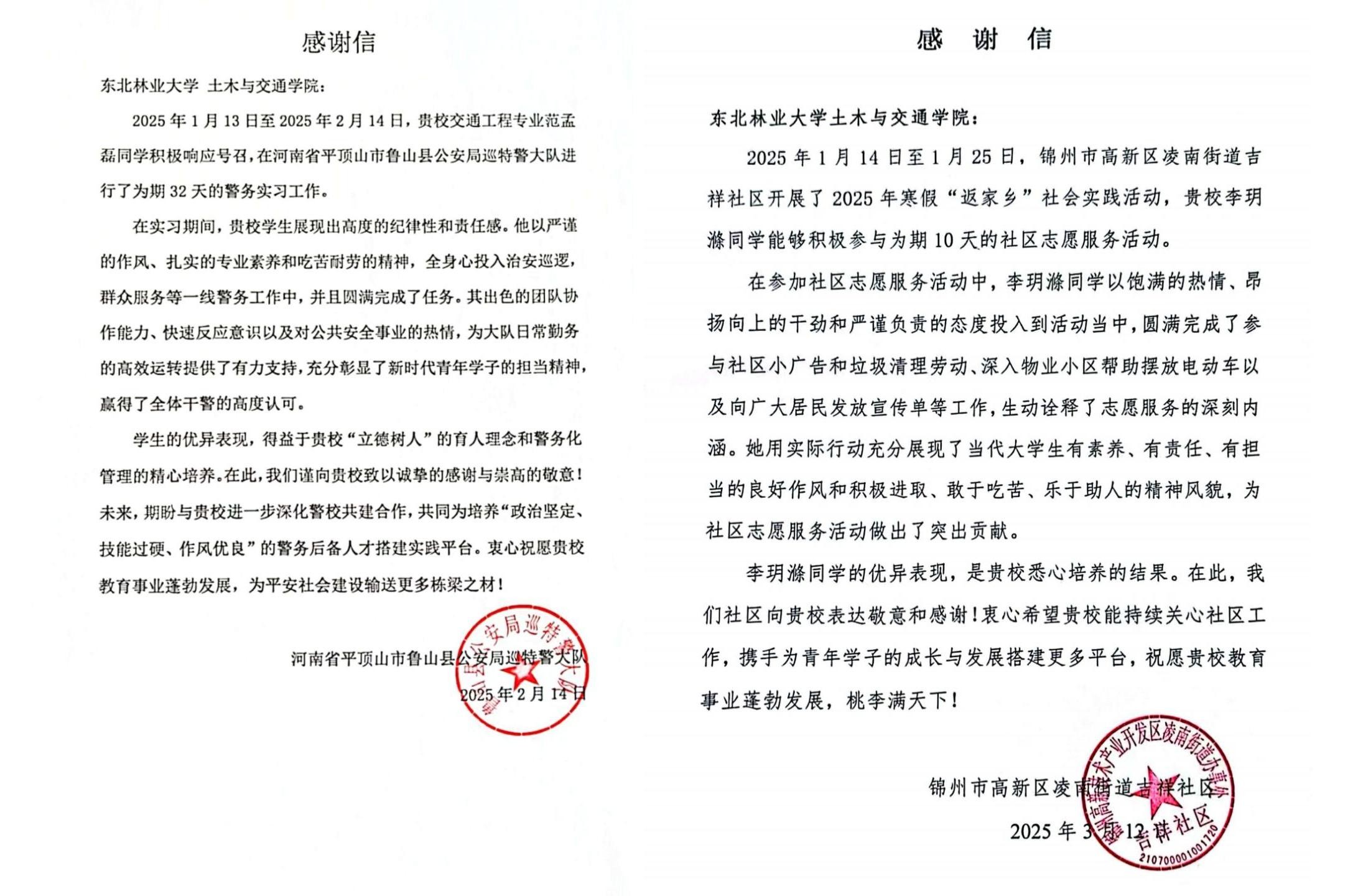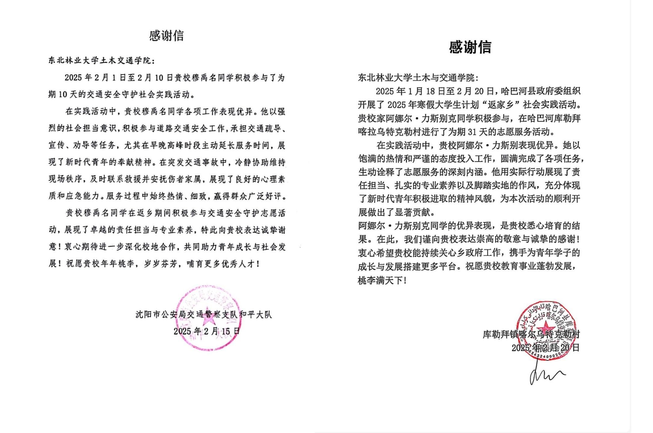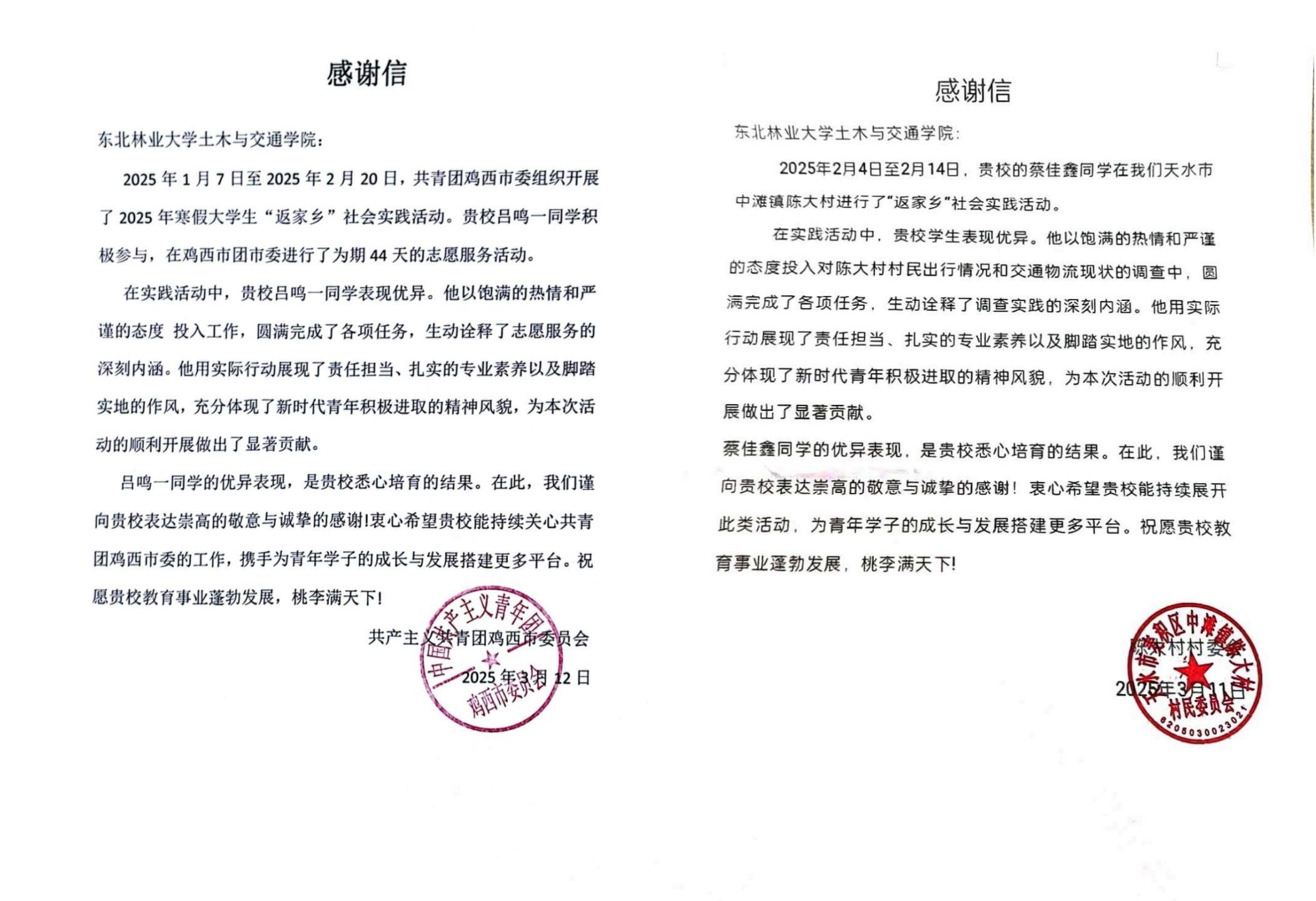 近日,随着2025年寒假大学生“返家乡”社会实践活动逐渐落下帷幕,我院陆续收到多封来自全国各地基层单位的“感谢信”!思政小课堂,社会大舞台,这些“温情回执”的背后,是我院广大学子实践成果和家乡发展需求的“双向奔赴”。
