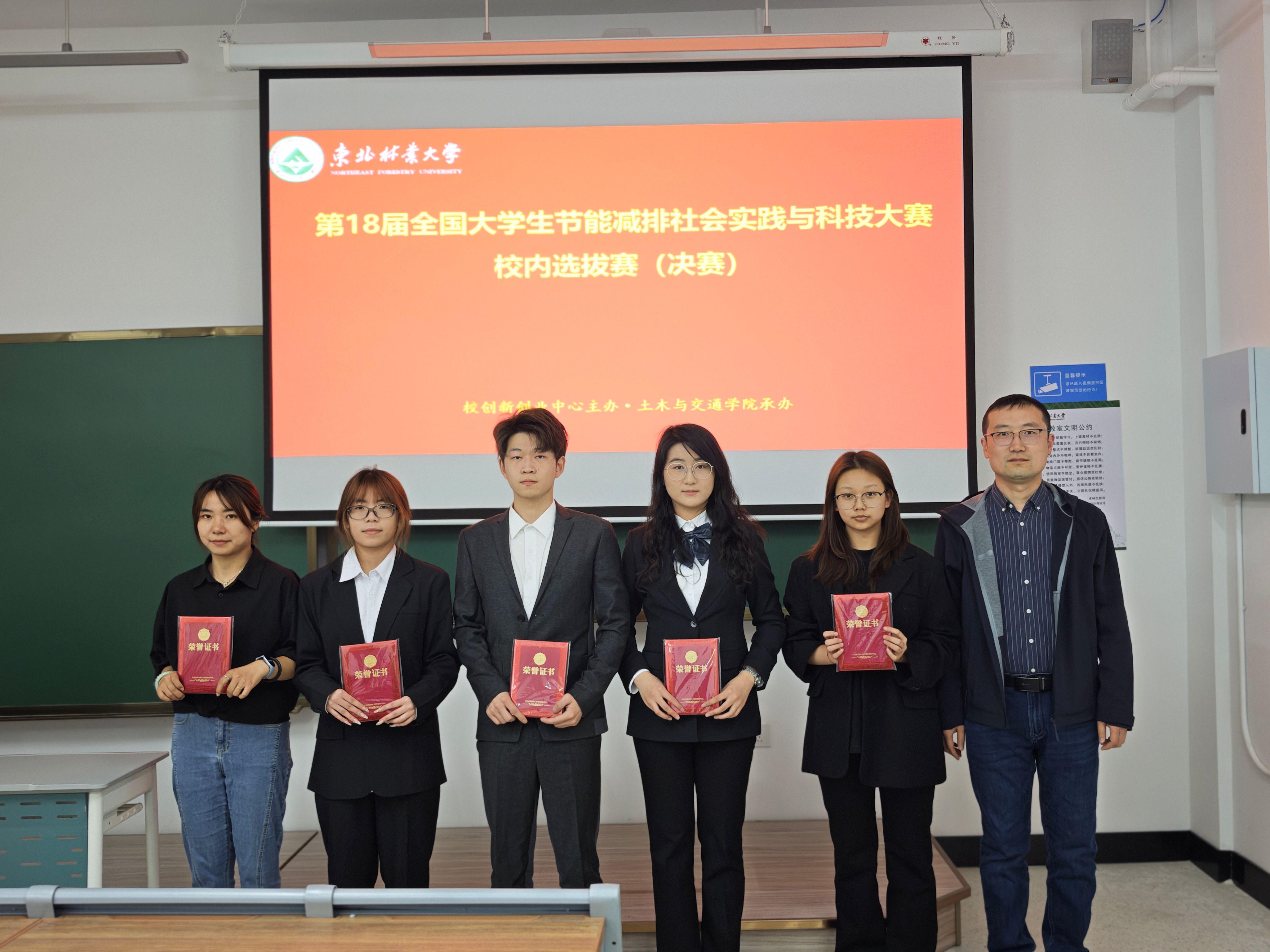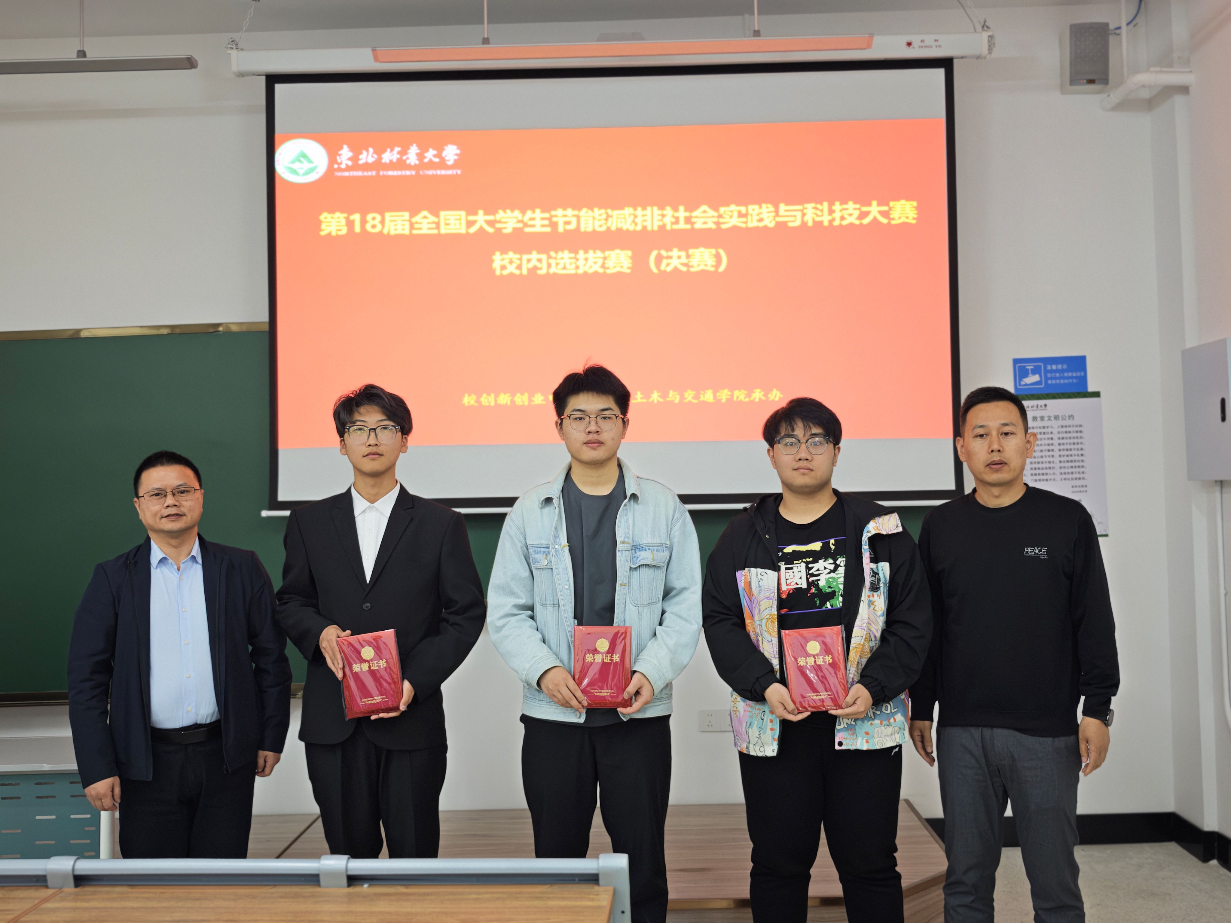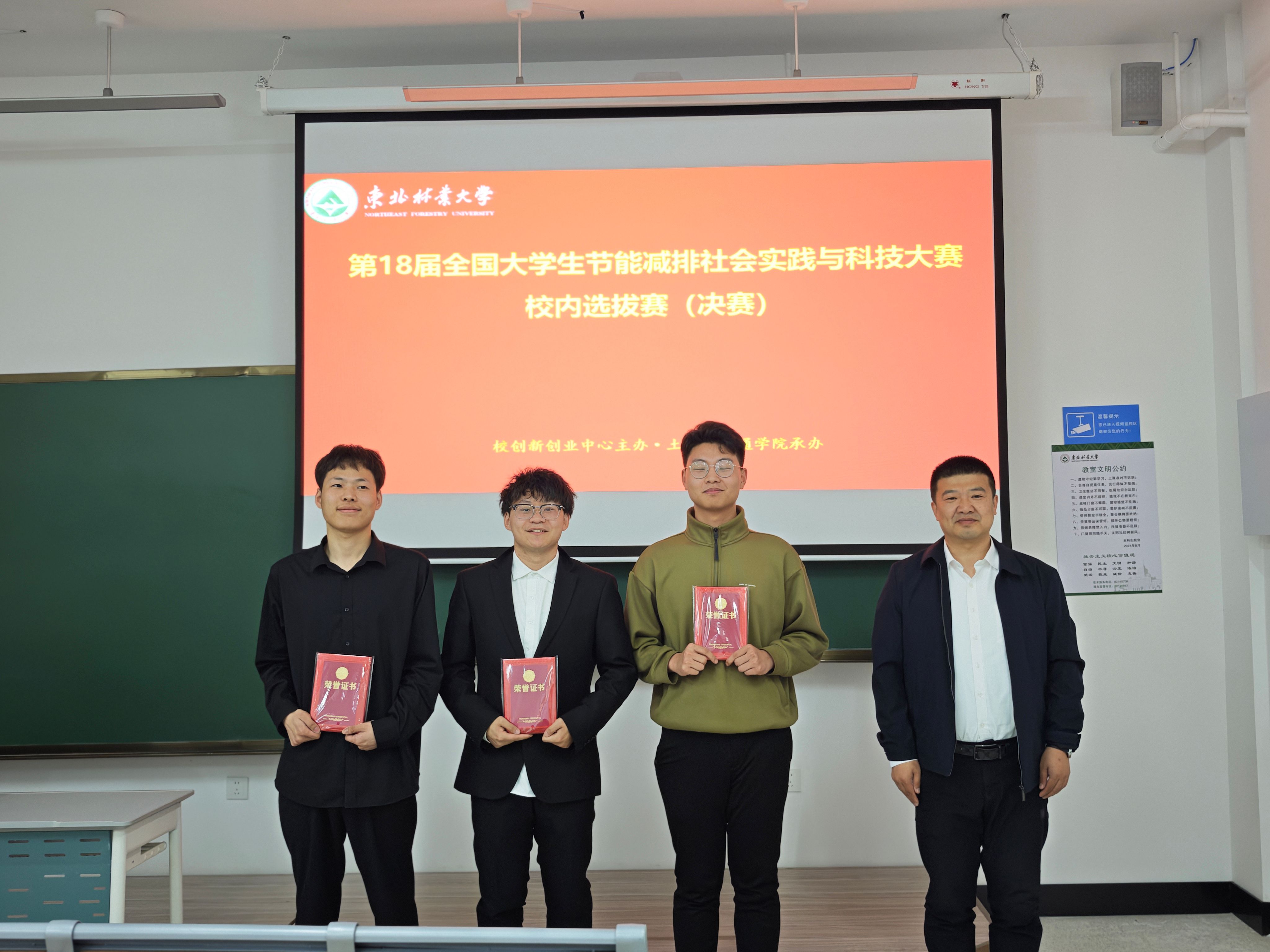 在决赛现场,各参赛团队通过严谨的学术汇报、生动的实物演示和深入的专家交流,充分展现了作品的科技含量与应用价值。4支一等奖团队凭借前沿的创新理念、扎实的专业基础和出色的现场表现赢得评委高度评价:《“消废蓄能,虚实净航”-基于Unity3D引擎与国产仿真软件Mworks的四旋翼飞行器仿真与模拟操作平台》作品创新性地将虚拟仿真技术应用于无人机节能减排优化,通过高精度建模与算法优化,显著提升飞行器能源利用效率,体现了团队在计算机模拟与能源系统优化方面的专业素养。《绿木方程-木基锌空电池解构双碳新路径》作品团队利用生物质材料改性技术,开发出高性能木基锌空电池,为新能源存储提供绿色解决方案,其实验数据的严谨性和产业化潜力获得评委一致认可。《“绿循智桶”—双碳节能型智能垃圾分拣平台》结合物联网与AI图像识别技术,团队设计出智能垃圾分类系统,通过动态优化分拣算法实现能耗降低30%,展现了工程实践与智能化结合的创新能力。《基于光电协同与掺杂双驱动的高效锌离子电池设计》通过材料微结构调控与光电协同效应,突破传统锌离子电池性能瓶颈,其理论深度与实验验证的完备性凸显了团队在电化学能源领域的专业功底。这些获奖作品不仅技术含量高,更体现了同学们在备赛过程中主动钻研、团队协作、反复优化的科研精神。参赛队员在答辩环节逻辑清晰、应对自如,展现出东林学子扎实的专业基础和昂扬的创新风貌。