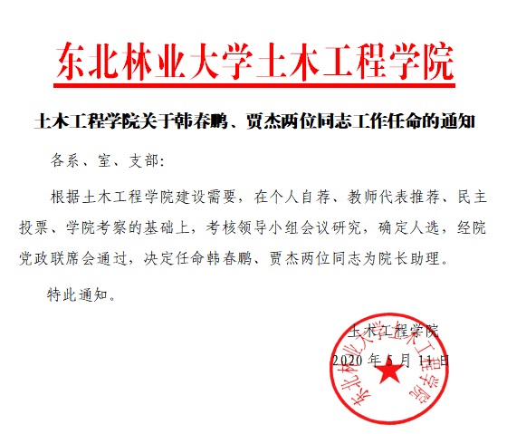 土木工程学院关于韩春鹏、贾杰两位同志工作任命的通知