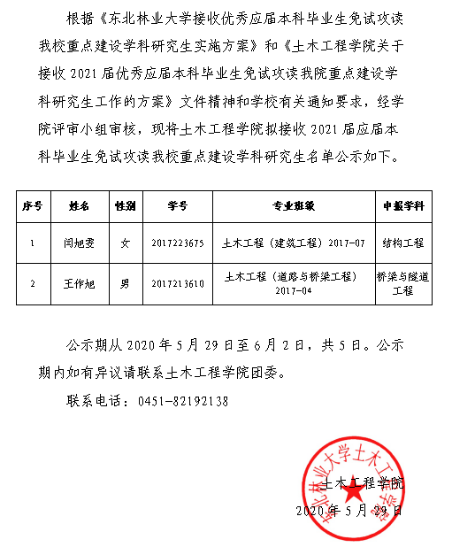 土木工程学院拟接收2021届应届本科毕业生免试攻读我校重点建设学科研究生情况公示