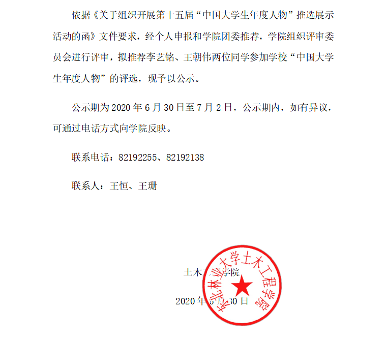 关于土木工程学院拟推荐参加学校“中国大学生年度人物”评选的公示
