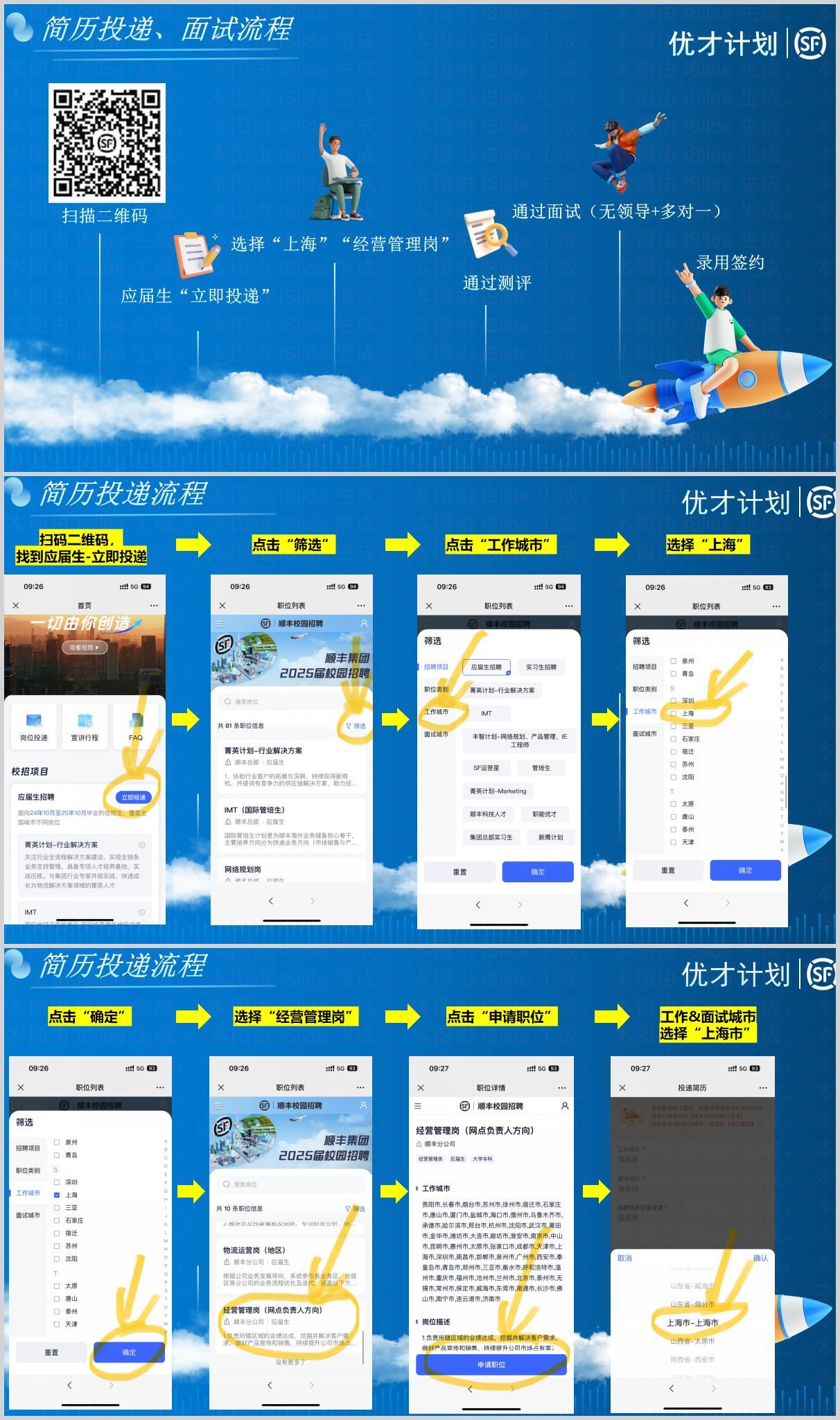 关注“上海顺丰招聘”微信公众号,选择校招网申,手机号登录后工作城市选择“上海市”、职位选择“经营管理岗”,优才计划投递详见下图流程